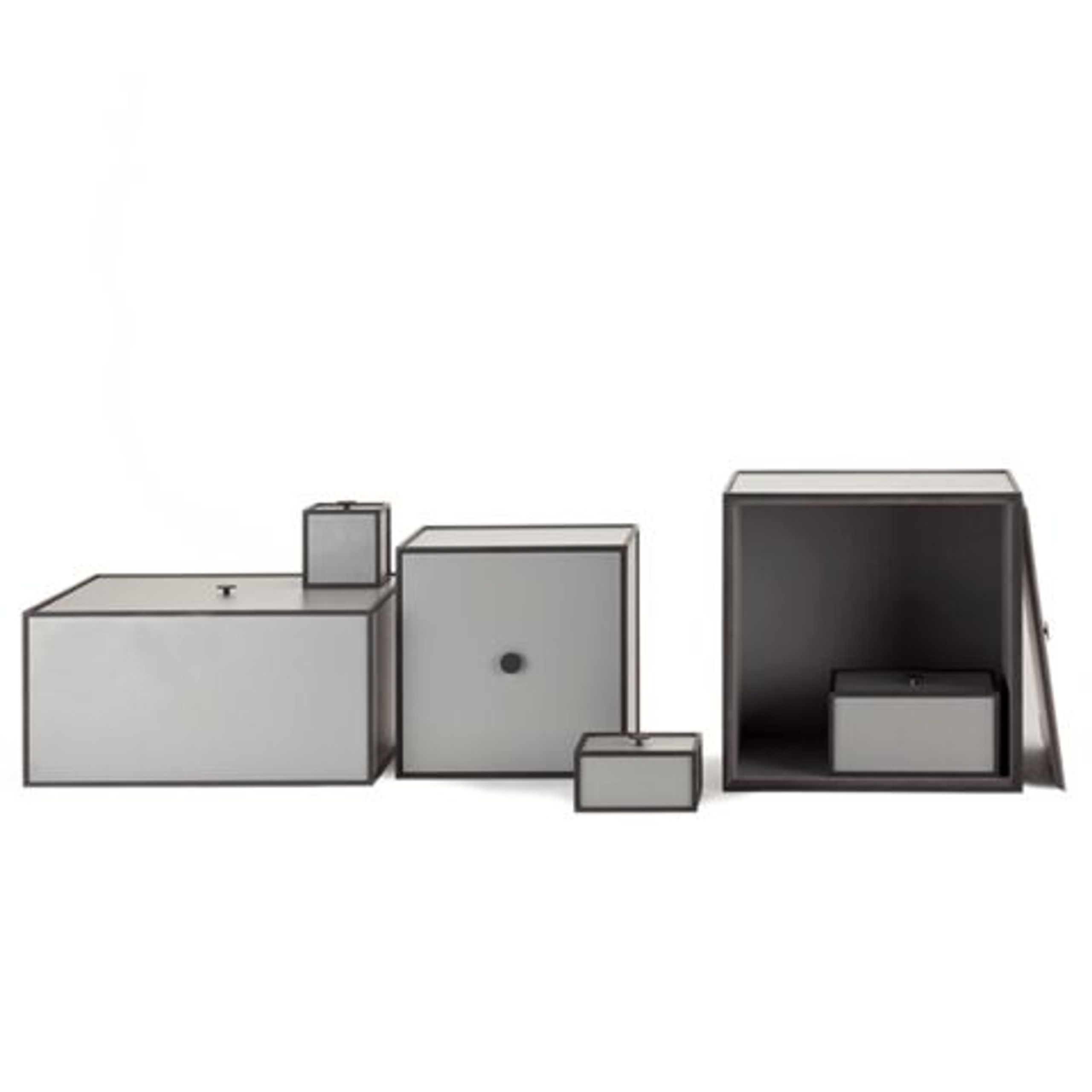 Frame tilbyder en innovativ opbevaringsserie bestående af firkantede moduler indrammet i minimalistiske, kubiske strukturer. Disse enheder kan enten monteres direkte på væggen, arrangeres i stabler eller placeres frit på gulvet, hvilket giver dig mulighed for at tilpasse din indretning præcis efter dine ønsker. Låget kan fjernes helt eller anvendes som en funktionel dør, så du kan skabe et personligt og fleksibelt opbevaringsmøbel.