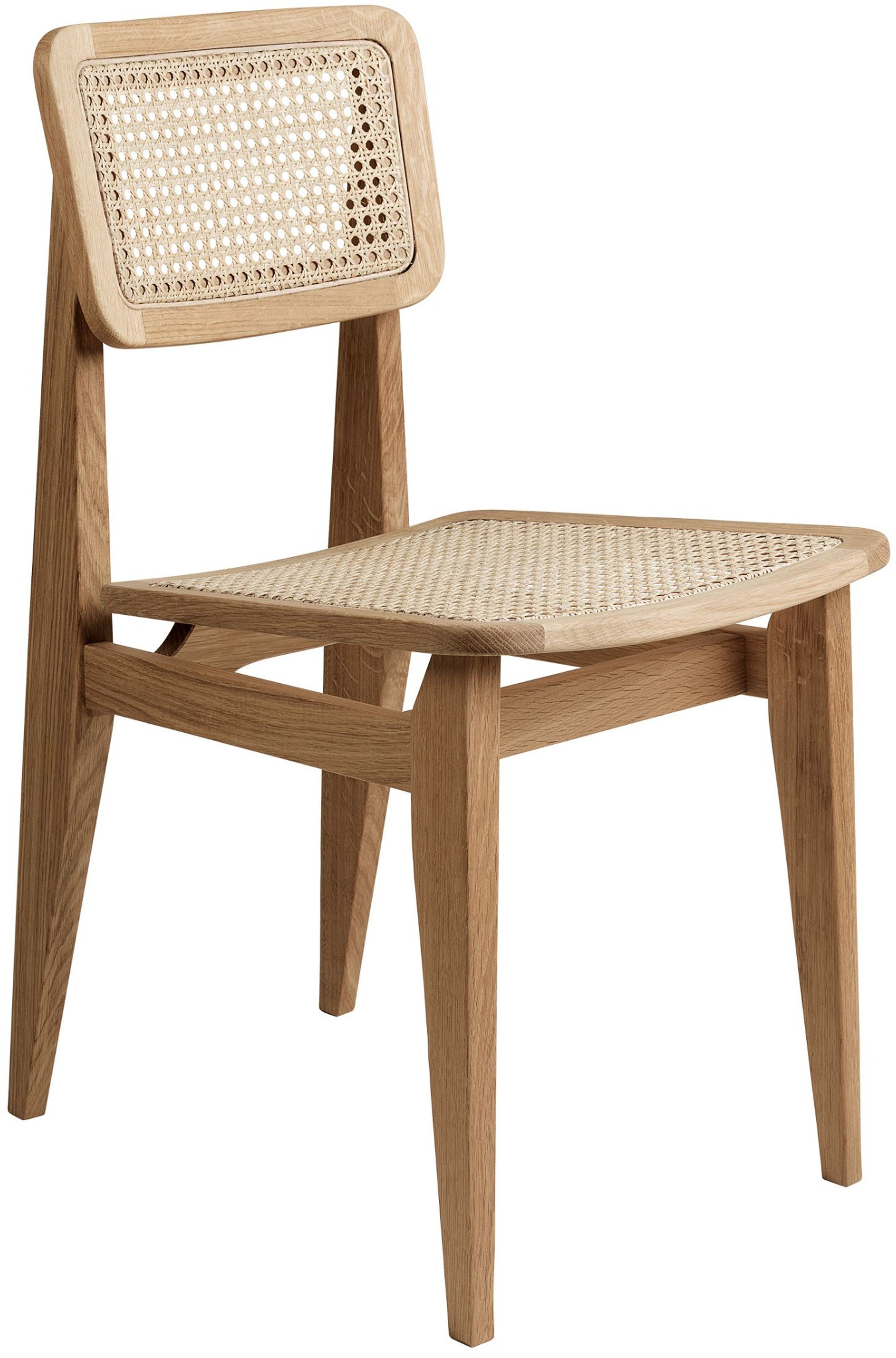 C-Chair Dining Chair - Un-Upholstered, All French Cane fra GUBI, designet af Marcel Gascoin, repræsenterer et tidløst mesterværk med dybe rødder i Frankrigs efterkrigstid. Skabt i 1947 som en løsning til moderne hjem med begrænset plads, forener denne stol smukke proportioner med robust håndværk og finurlige detaljer. Den franske fletning på sædet og de markante ben tilfører stolen både en klassisk charme og et nutidigt udtryk. Den upolstrede version fremhæver stolens ægte materialer og den omhyggelige bearbejdning.